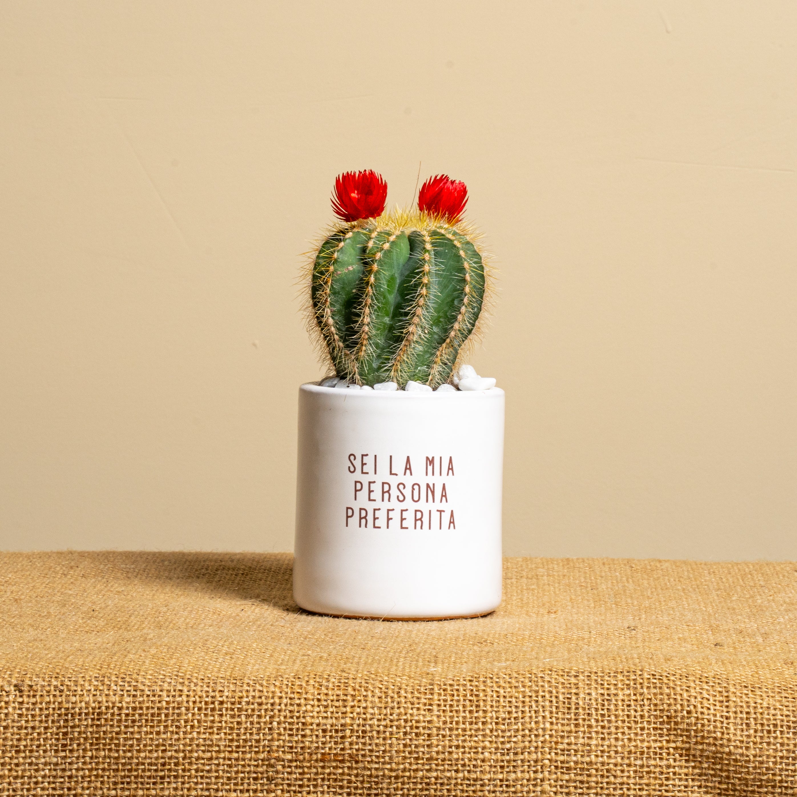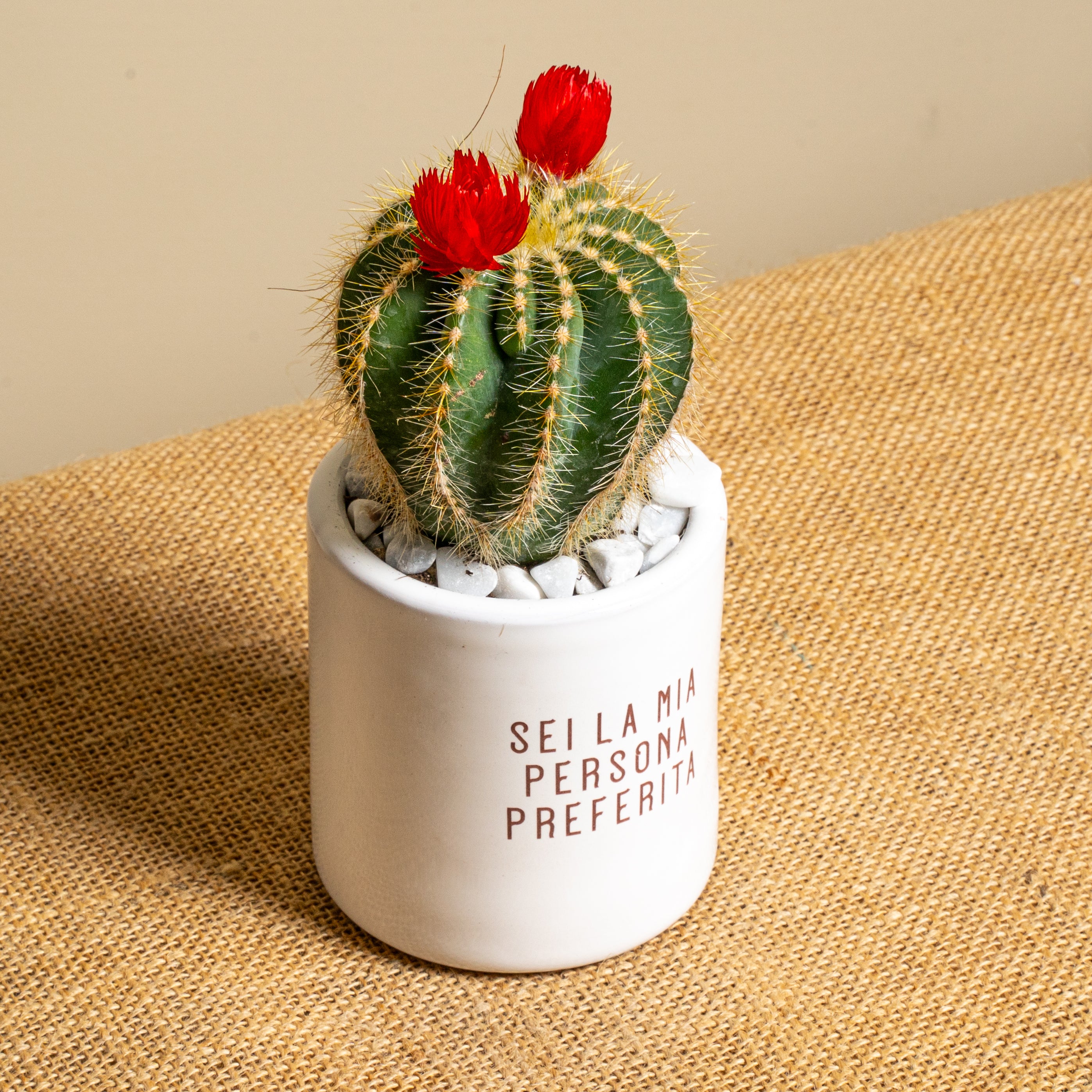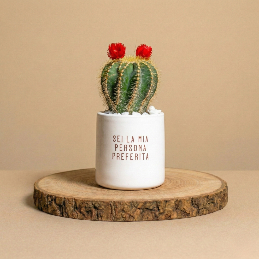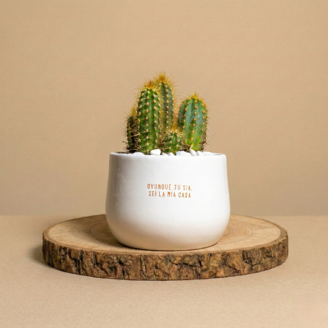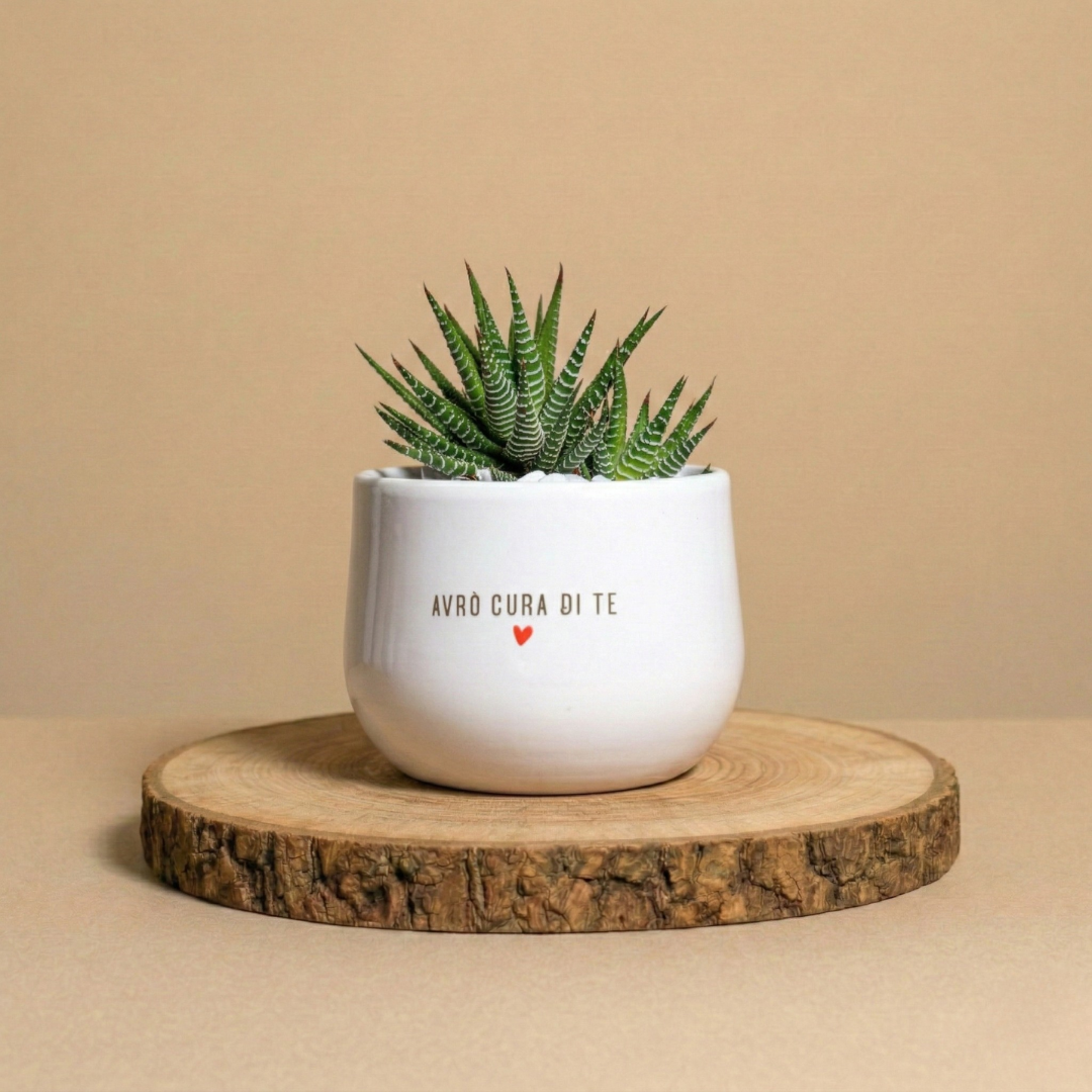 La piantina è riposta con cura nel vaso scelto, con terreno di qualità e guarnizioni per renderla elegante e non macchiare