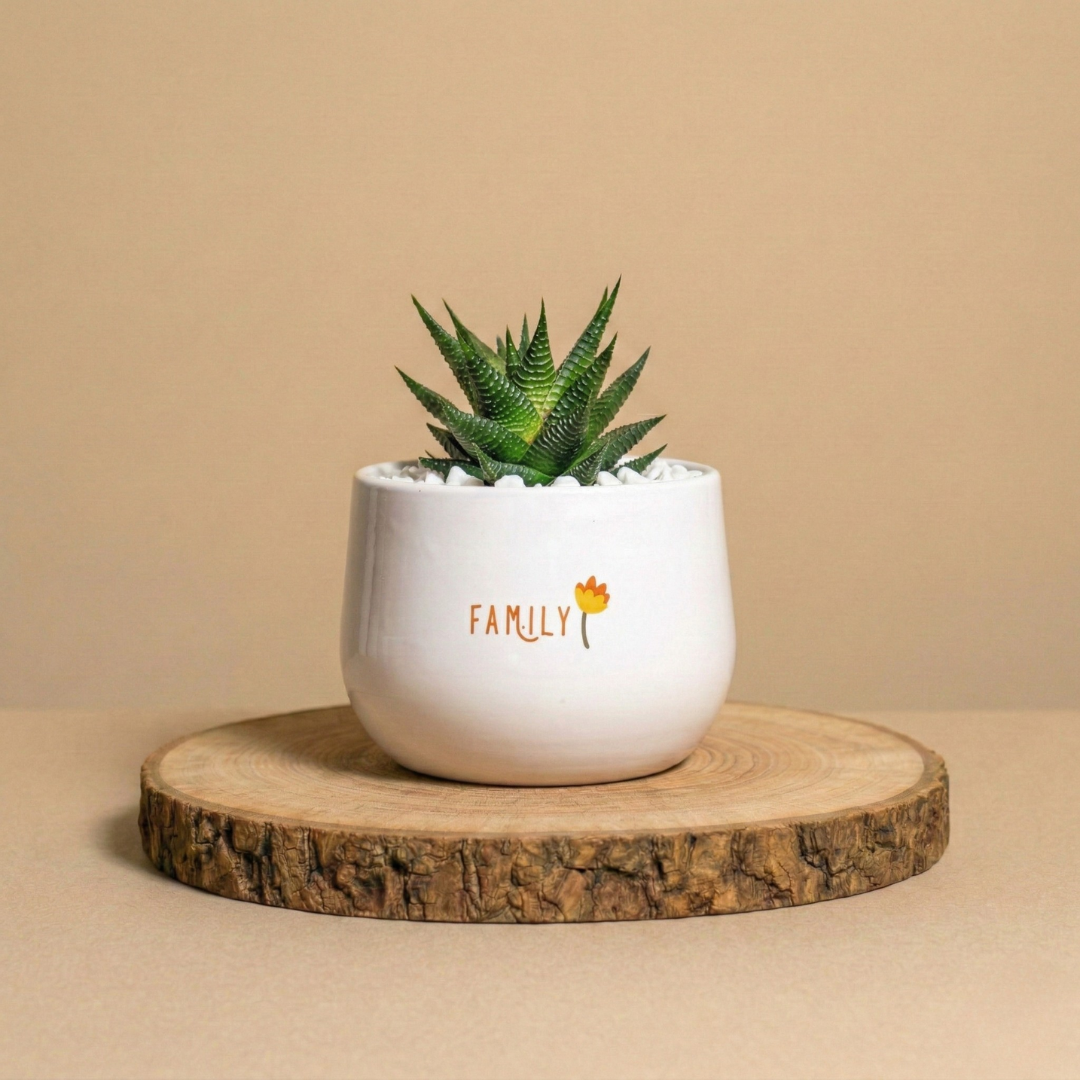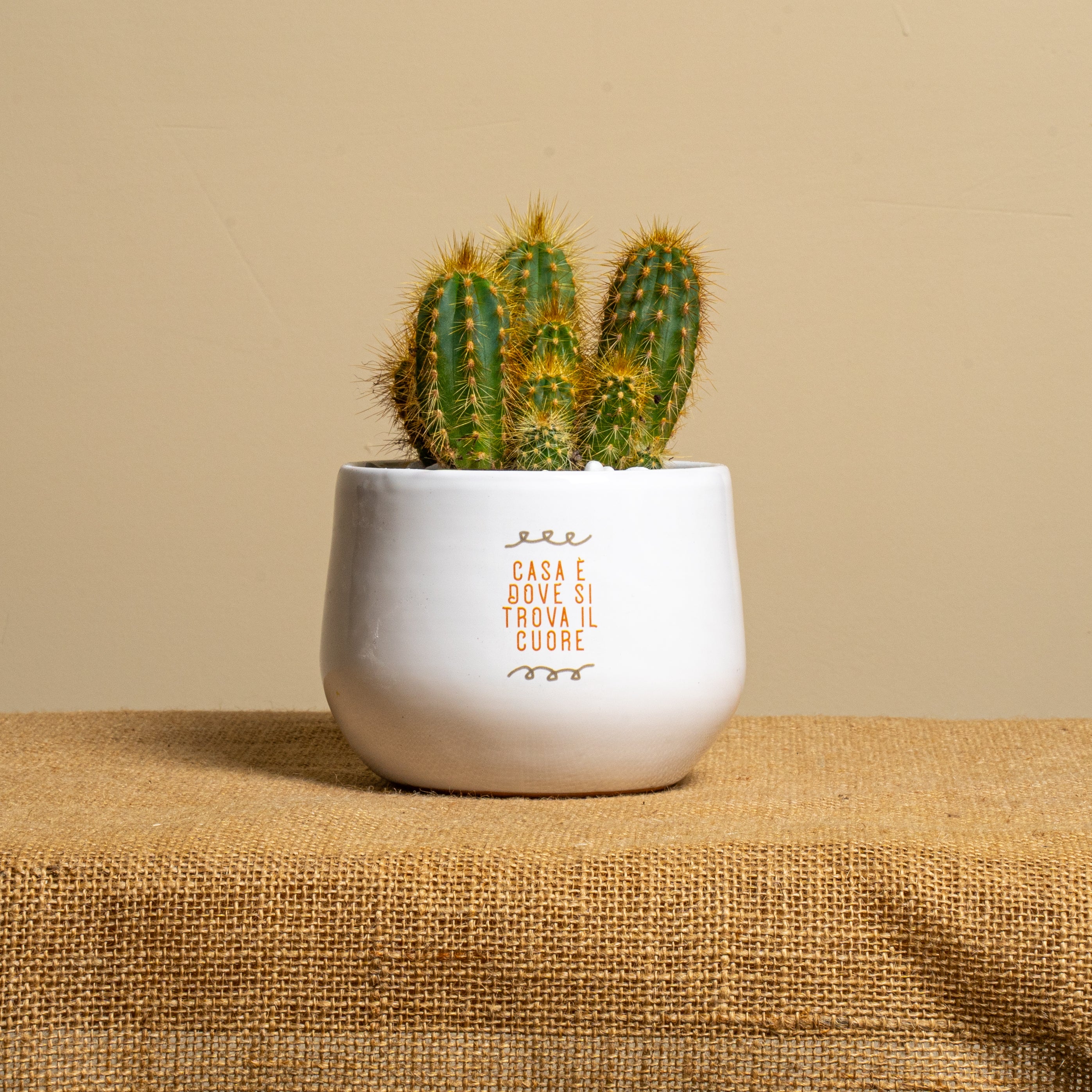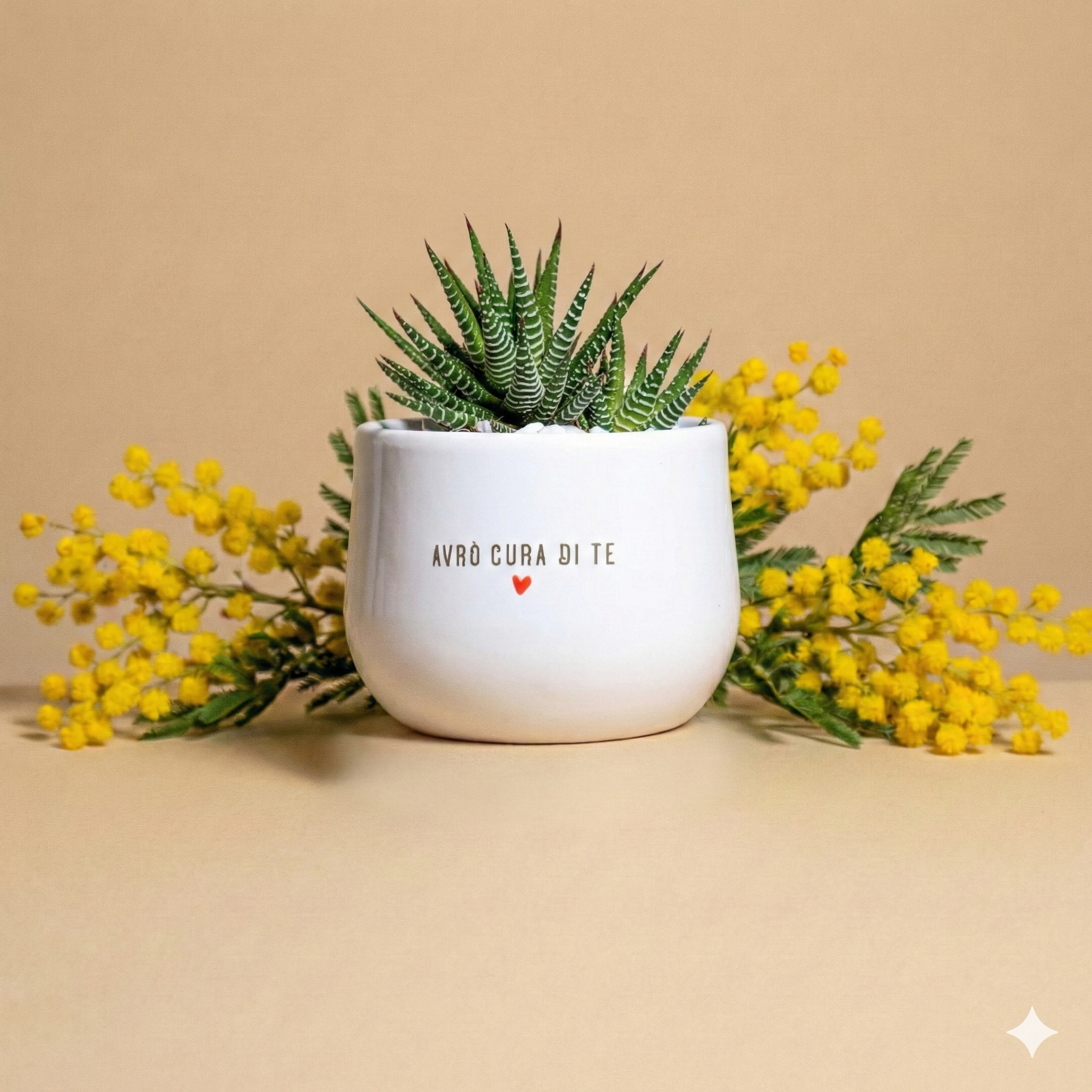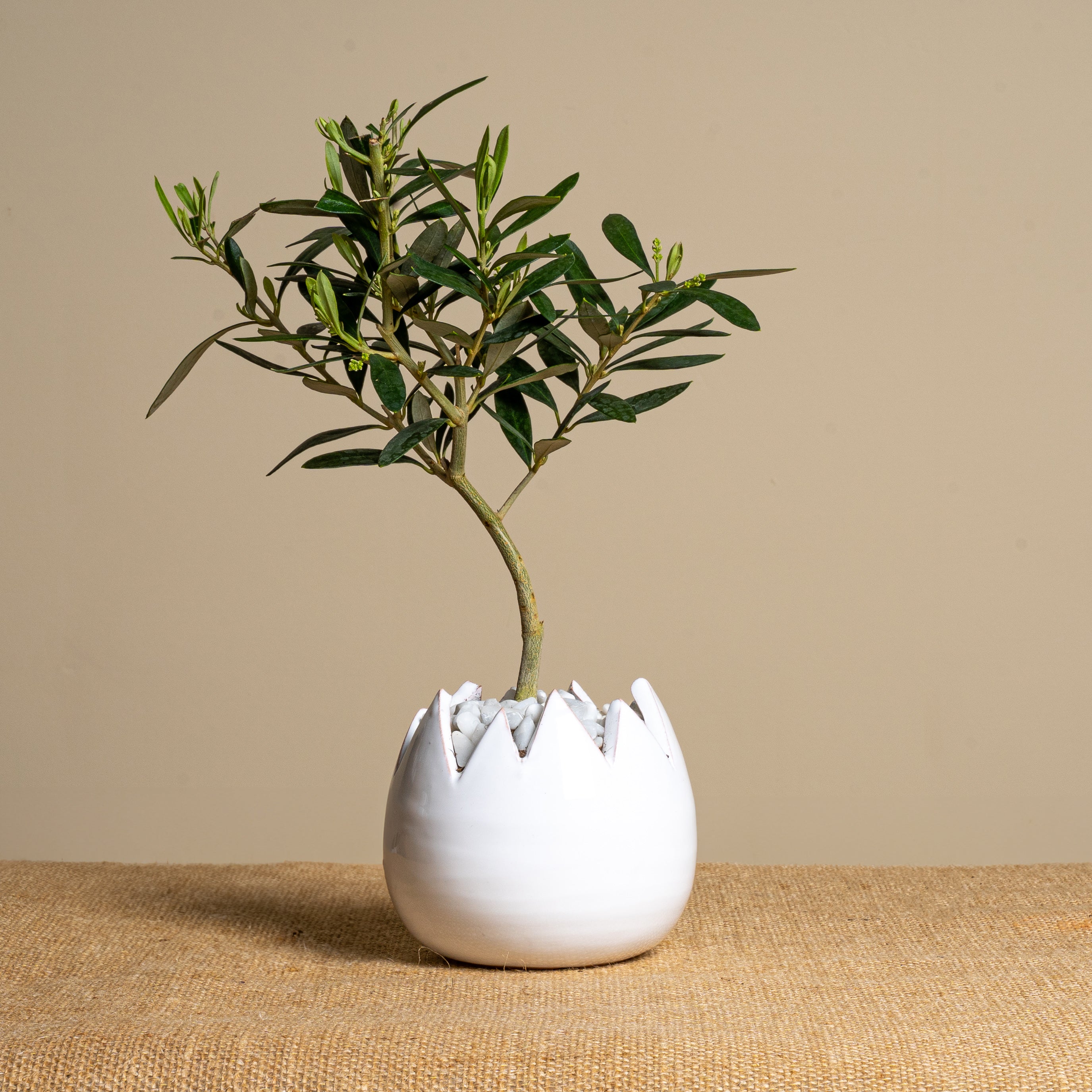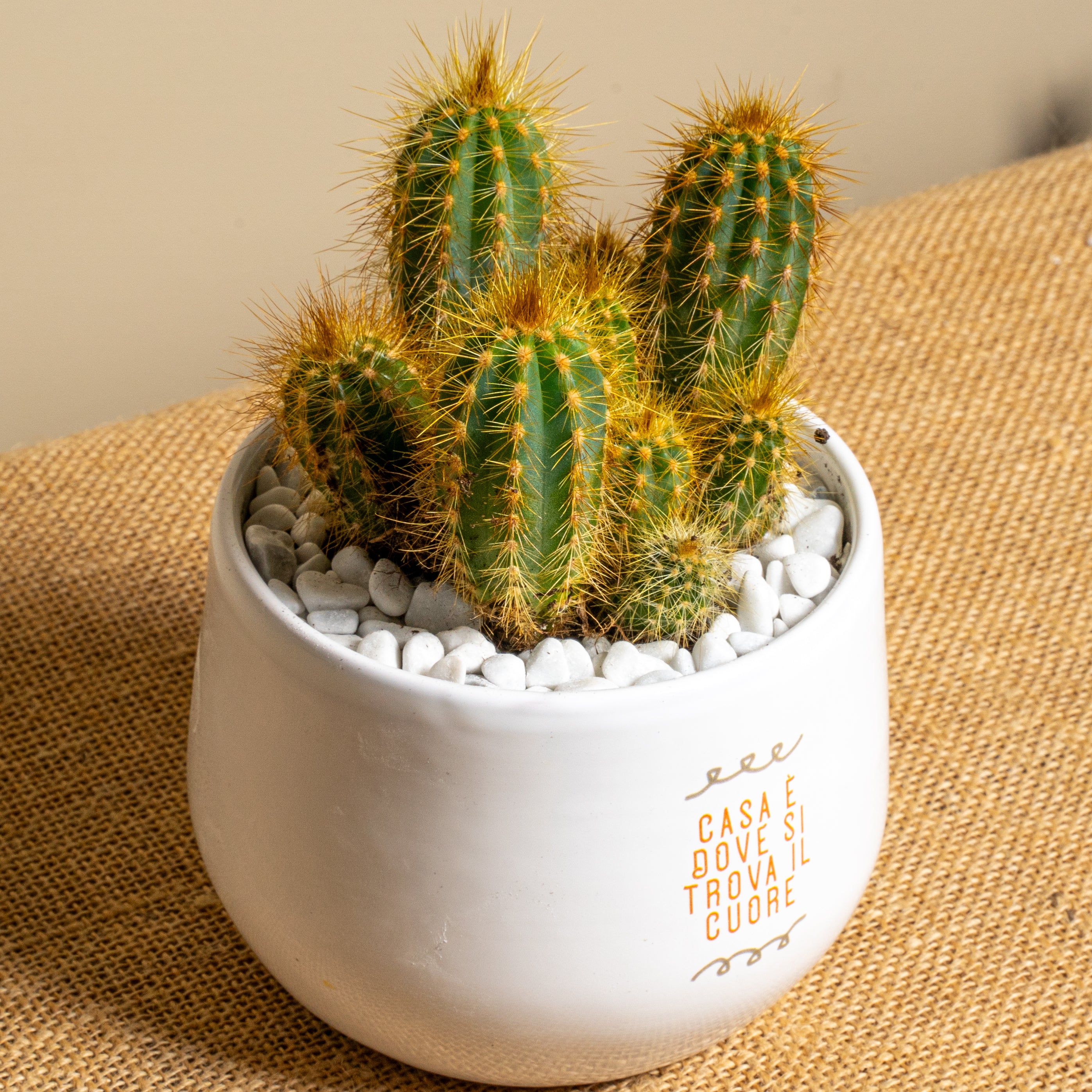 La piantina è riposta con cura nel vaso scelto, con terreno di qualità e guarnizioni per renderla elegante e non macchiare