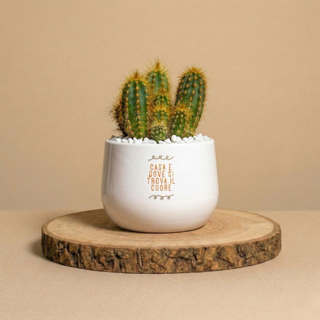 Il nostro vaso di ceramica: un rifugio per il tuo cuore. Aggiungi calore e accoglienza alla tua casa con questo tocco unico, personalizzato con la frase "Casa è dove si trova il cuore". Al suo interno troverai un cactus vero, simbolo di forza e resilienza, per rendere ogni angolo ancora più speciale.